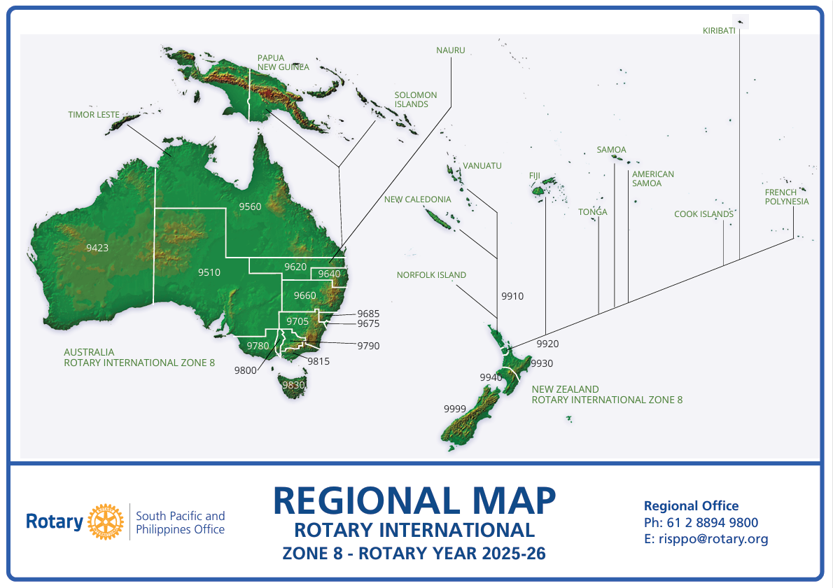 Rotary South Pacific includes Australia, New Zealand, American Samoa, Cook Islands, Fiji, French Polynesia, Kiribati, Nauru, New Caledonia, Norfolk Island, Papua New Guinea, Samoa, Solomon Islands, Timor Leste, Tonga and Vanuatu.
